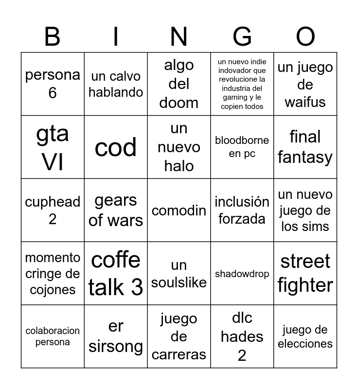 This bingo card has a free space and 24 words: coffe talk 3, er sirsong, un nuevo halo, colaboracion persona, un juego de waifus, persona 6, gta VI, un calvo hablando, inclusión forzada, un soulslike, bloodborne en pc, cuphead 2, shadowdrop, street fighter, cod, dlc hades 2, un nuevo juego de los sims, algo del doom, final fantasy, gears of wars, juego de elecciones, momento cringe de cojones, un nuevo indie indovador que revolucione la industria del gaming y le copien todos and juego de carreras.