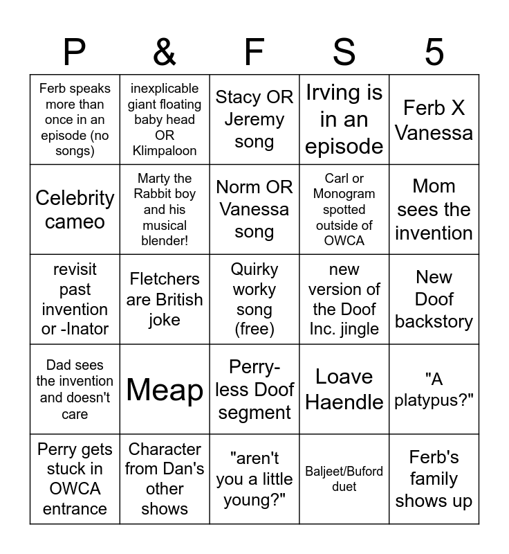 This bingo card has a free space and 24 words: Meap, Character from Dan's other shows, Norm OR Vanessa song, Perry gets stuck in OWCA entrance, Ferb X Vanessa, Ferb speaks more than once in an episode (no songs), Celebrity cameo, inexplicable giant floating baby head OR Klimpaloon, new version of the Doof Inc. jingle, Perry-less Doof segment, Carl or Monogram spotted outside of OWCA, revisit past invention or -Inator, Loave Haendle, "A platypus?", Marty the Rabbit boy and his musical blender!, Baljeet/Buford duet, New Doof backstory, Stacy OR Jeremy song, Mom sees the invention, Fletchers are British joke, Ferb's family shows up, Dad sees the invention and doesn't care, Irving is in an episode and "aren't you a little young?".