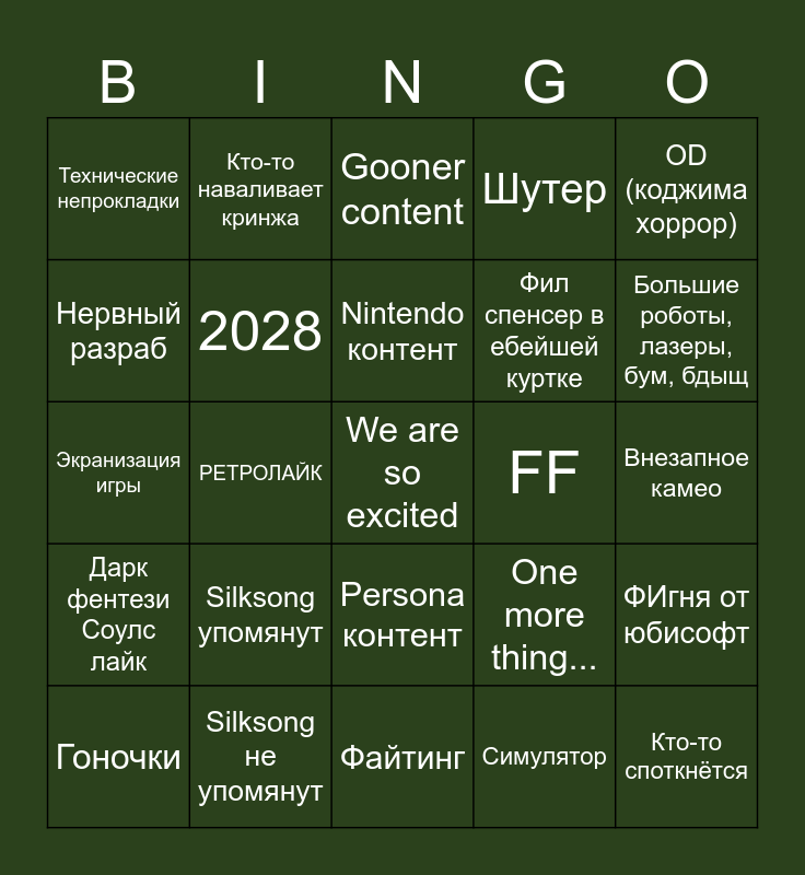 This bingo card has a free space and 24 words: Silksong упомянут, Silksong не упомянут, Nintendo контент, Гоночки, OD (коджима хоррор), Технические непрокладки, Нервный разраб, Кто-то наваливает кринжа, FF, Persona контент, Фил спенсер в ебейшей куртке, Экранизация игры, One more thing..., ФИгня от юбисофт, 2028, Симулятор, Внезапное камео, Gooner content, Большие роботы, лазеры, бум, бдыщ, РЕТРОЛАЙК, Кто-то споткнётся, Дарк фентези Соулс лайк, Шутер and Файтинг.