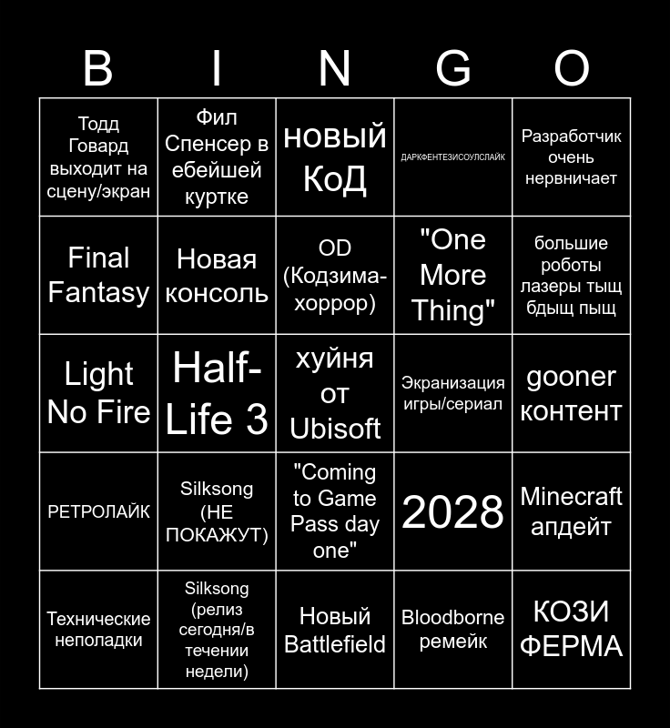 This bingo card has a free space and 24 words: Silksong (НЕ ПОКАЖУТ), Silksong (релиз сегодня/в течении недели), OD (Кодзима-хоррор), Технические неполадки, Разработчик очень нервничает, Тодд Говард выходит на сцену/экран, Final Fantasy, Фил Спенсер в ебейшей куртке, Экранизация игры/сериал, "Coming to Game Pass day one", "One More Thing", Light No Fire, 2028, Minecraft апдейт, Новая консоль, Bloodborne ремейк, gooner контент, новый КоД, большие роботы лазеры тыщ бдыщ пыщ, Half-Life 3, КОЗИ ФЕРМА, РЕТРОЛАЙК, ДАРКФЕНТЕЗИСОУЛСЛАЙК and Новый Battlefield.