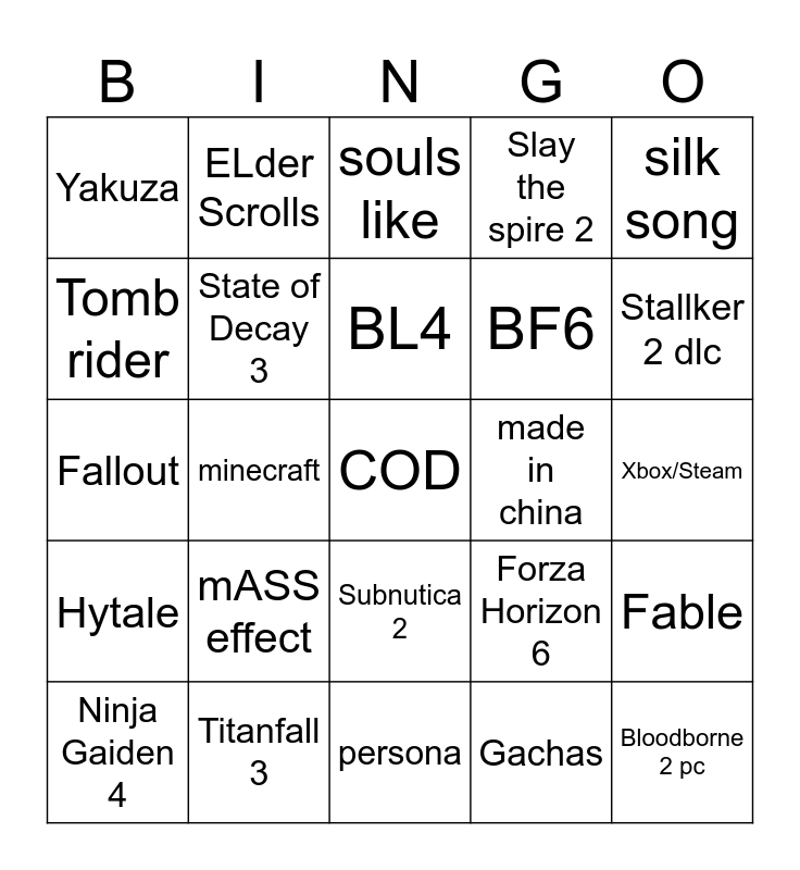 This bingo card has a free space and 24 words: mASS effect, Titanfall 3, BL4, Ninja Gaiden 4, silk song, Yakuza, Tomb rider, ELder Scrolls, made in china, Subnutica 2, BF6, Fallout, Forza Horizon 6, Fable, State of Decay 3, Gachas, Xbox/Steam, souls like, Stallker 2 dlc, minecraft, Bloodborne 2 pc, Hytale, Slay the spire 2 and persona.