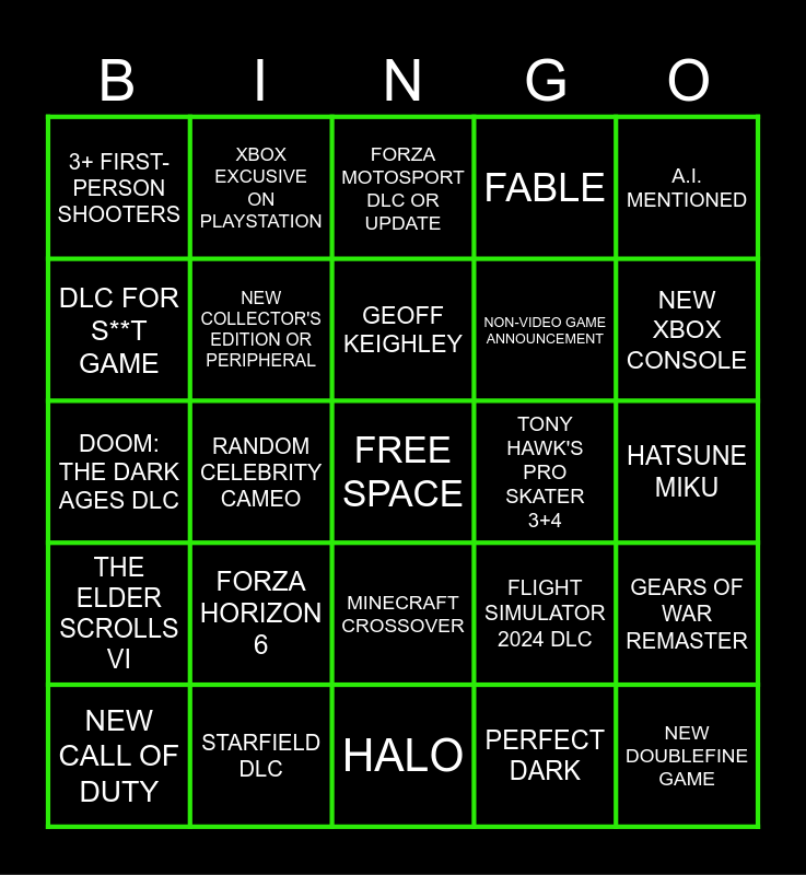 This bingo card has a free space and 24 words: FORZA HORIZON 6, STARFIELD DLC, GEOFF KEIGHLEY, NEW CALL OF DUTY, A.I. MENTIONED, 3+ FIRST-PERSON SHOOTERS, DLC FOR S**T GAME, XBOX EXCUSIVE ON PLAYSTATION, TONY HAWK'S PRO SKATER 3+4, MINECRAFT CROSSOVER, NON-VIDEO GAME ANNOUNCEMENT, DOOM: THE DARK AGES DLC, FLIGHT SIMULATOR 2024 DLC, GEARS OF WAR REMASTER, NEW COLLECTOR'S EDITION OR PERIPHERAL, PERFECT DARK, HATSUNE MIKU, FORZA MOTOSPORT DLC OR UPDATE, NEW XBOX CONSOLE, RANDOM CELEBRITY CAMEO, NEW DOUBLEFINE GAME, THE ELDER SCROLLS VI, FABLE and HALO.