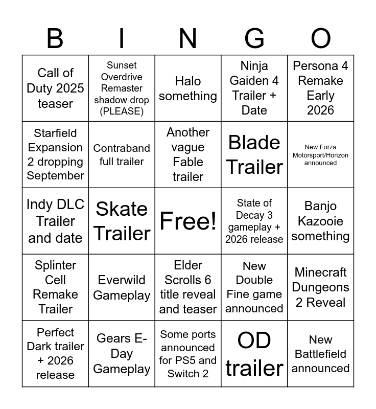 This bingo card has a free space and 24 words: Everwild Gameplay, Gears E-Day Gameplay, Another vague Fable trailer, Perfect Dark trailer + 2026 release, Persona 4 Remake Early 2026, Call of Duty 2025 teaser, Starfield Expansion 2 dropping September, Sunset Overdrive Remaster shadow drop (PLEASE), State of Decay 3 gameplay + 2026 release, Elder Scrolls 6 title reveal and teaser, Blade Trailer, Indy DLC Trailer and date, New Double Fine game announced, Minecraft Dungeons 2 Reveal, Contraband full trailer, OD trailer, Banjo Kazooie something, Halo something, New Forza Motorsport/Horizon announced, Skate Trailer, New Battlefield announced, Splinter Cell Remake Trailer, Ninja Gaiden 4 Trailer + Date and Some ports announced for PS5 and Switch 2.