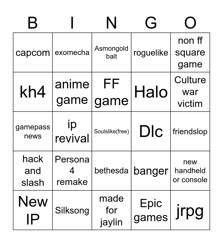 This bingo card has a free space and 24 words: Persona 4 remake, Silksong, FF game, New IP, non ff square game, capcom, kh4, exomecha, Dlc, bethesda, Halo, gamepass news, banger, new handheld or console, anime game, Epic games, friendslop, Asmongold bait, Culture war victim, ip revival, jrpg, hack and slash, roguelike and made for jaylin.