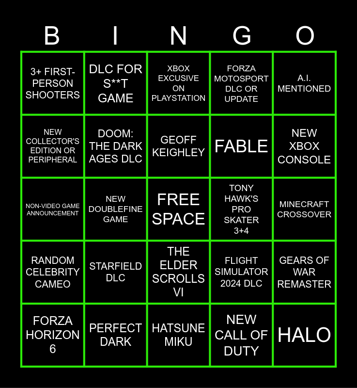 This bingo card has a free space and 24 words: FORZA HORIZON 6, STARFIELD DLC, GEOFF KEIGHLEY, NEW CALL OF DUTY, A.I. MENTIONED, 3+ FIRST-PERSON SHOOTERS, DLC FOR S**T GAME, XBOX EXCUSIVE ON PLAYSTATION, TONY HAWK'S PRO SKATER 3+4, MINECRAFT CROSSOVER, NON-VIDEO GAME ANNOUNCEMENT, DOOM: THE DARK AGES DLC, FLIGHT SIMULATOR 2024 DLC, GEARS OF WAR REMASTER, NEW COLLECTOR'S EDITION OR PERIPHERAL, PERFECT DARK, HATSUNE MIKU, FORZA MOTOSPORT DLC OR UPDATE, NEW XBOX CONSOLE, RANDOM CELEBRITY CAMEO, NEW DOUBLEFINE GAME, THE ELDER SCROLLS VI, FABLE and HALO.