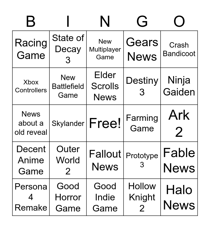 This bingo card has a free space and 24 words: Persona 4 Remake, Outer World 2, Elder Scrolls News, Hollow Knight 2, Crash Bandicoot, Racing Game, State of Decay 3, New Multiplayer Game, Farming Game, Ark 2, News about a old reveal, New Battlefield Game, Prototype 3, Fable News, Xbox Controllers, Good Horror Game, Good Indie Game, Gears News, Ninja Gaiden, Decent Anime Game, Skylander, Fallout News, Destiny 3 and Halo News.