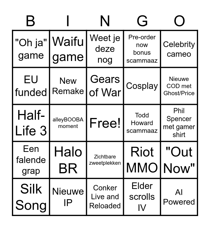 This bingo card has a free space and 24 words: Silk Song, Halo BR, Gears of War, Elder scrolls IV, Celebrity cameo, "Oh ja" game, Waifu game, Weet je deze nog, Todd Howard scammaaz, Phil Spencer met gamer shirt, Half-Life 3, New Remake, Riot MMO, "Out Now", EU funded, Nieuwe IP, Conker Live and Reloaded, Pre-order now bonus scammaaz, Nieuwe COD met Ghost/Price, Een falende grap, alleyBOOBA moment, Zichtbare zweetplekken, Cosplay and AI Powered.