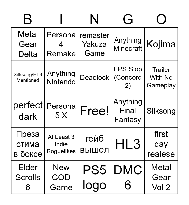 This bingo card has a free space and 24 words: At Least 3 Indie Roguelikes, New COD Game, Deadlock, Elder Scrolls 6, Kojima, Metal Gear Delta, Silksong/HL3 Mentioned, Persona 4 Remake, Anything Final Fantasy, гейб вышел, FPS Slop (Concord 2), perfect dark, HL3, first day realese, Anything Nintendo, DMC 6, Silksong, remaster Yakuza Game, Trailer With No Gameplay, Persona 5 X, Metal Gear Vol 2, Преза стима в боксе, Anything Minecraft and PS5 logo.