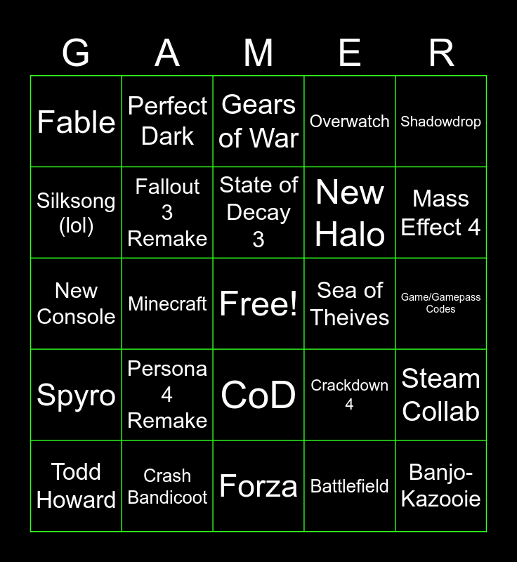 This bingo card has a free space and 25 words: Persona 4 Remake, Forza, State of Decay 3, Todd Howard, Shadowdrop, Fable, Silksong (lol), Perfect Dark, Sea of Theives, CoD, New Halo, New Console, Crackdown 4, Steam Collab, Fallout 3 Remake, Kojima, Game/Gamepass Codes, Gears of War, Mass Effect 4, Minecraft, Banjo-Kazooie, Crash Bandicoot, Spyro, Overwatch and Battlefield.