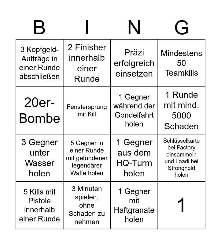 This bingo card has 17 words: 1 Gegner mit Haftgranate holen, 5 Kills mit Pistole innerhalb einer Runde, Präzi erfolgreich einsetzen, 3 Kopfgeld-Aufträge in einer Runde abschließen, 5 Gegner in einer Runde mit gefundener legendärer Waffe holen, Mindestens 50 Teamkills, Schlüsselkarte bei Factory einsammeln und Loadi bei Stronghold holen, 1 Gegner während der Gondelfahrt holen, 1 Runde mit mind. 5000 Schaden, Fenstersprung mit Kill, 3 Minuten spielen, ohne Schaden zu nehmen, 1 Gegner aus dem HQ-Turm holen, 20er-Bombe, 2 Finisher innerhalb einer Runde, 3 Gegner unter Wasser holen, 1 Gegner mit Thermit holen and 1.