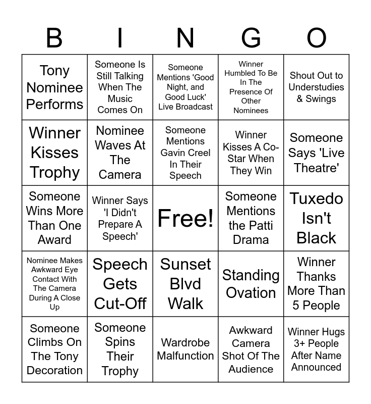 This bingo card has a free space and 34 words: A Winner Says 'Amazing' More Than Once In Their Speech, Awkward Camera Shot Of The Audience, Close -Up On Lin, Cynthia Calls Out Someone In Audience, Nominee Makes Awkward Eye Contact With The Camera During A Close Up, Nominee Waves At The Camera, Shout Out to Understudies & Swings, Someone Climbs On The Tony Decoration, Someone Is Still Talking When The Music Comes On, Someone Mentions A Teacher, Someone Mentions Gavin Creel In Their Speech, Someone Mentions 'Good Night, and Good Luck' Live Broadcast, Someone Mentions Hamilton 10 Year Anniversary, Someone Mentions Show Opening Next Season, Someone Mentions the Patti Drama, Someone Says 'Live Theatre', Someone Spins Their Trophy, Someone Wins More Than One Award, Speech Gets Cut-Off, Standing Ovation, Sunset Blvd Walk, Surprise Performer Appears, Tony Nominee Performs, Tuxedo Isn't Black, Wardrobe Malfunction, Winner Hugs 3+ People After Name Announced, Winner Humbled To Be In The Presence Of Other Nominees, Winner Is 'Blessed', Winner Kisses A Co-Star When They Win, Winner Kisses Trophy, Winner Puts On Glasses, Winner Says 'I Didn't Prepare A Speech', Winner Thanks More Than 5 People and Winner Thanks Other Nominees.