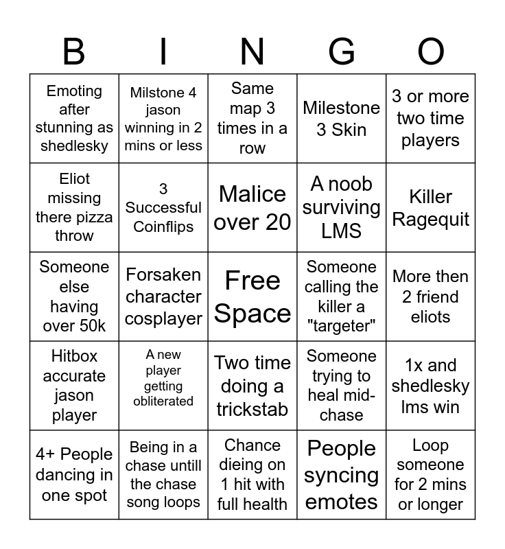 This bingo card has a free space and 24 words: A new player getting obliterated, Being in a chase untill the chase song loops, Malice over 20, 4+ People dancing in one spot, 3 or more two time players, Emoting after stunning as shedlesky, Eliot missing there pizza throw, Milstone 4 jason winning in 2 mins or less, Someone calling the killer a "targeter", Two time doing a trickstab, A noob surviving LMS, Someone else having over 50k, Someone trying to heal mid-chase, 1x and shedlesky lms win, 3 Successful Coinflips, People syncing emotes, More then 2 friend eliots, Same map 3 times in a row, Killer Ragequit, Forsaken character cosplayer, Loop someone for 2 mins or longer, Hitbox accurate jason player, Milestone 3 Skin and Chance dieing on 1 hit with full health.