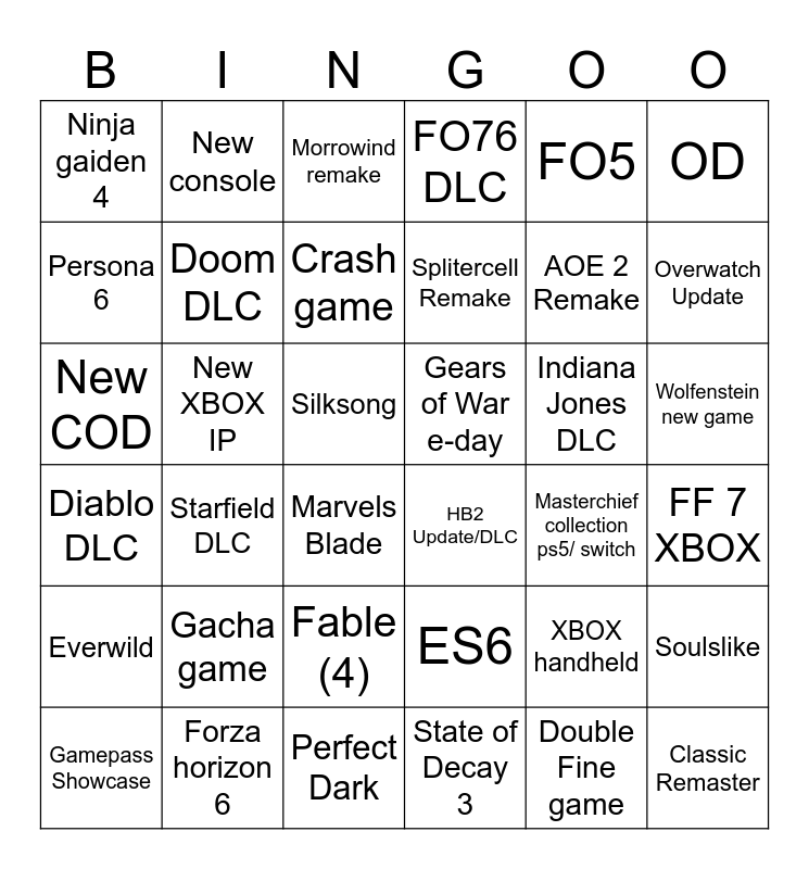 This bingo card has 36 words: ES6, Fable (4), State of Decay 3, Persona 6, Diablo DLC, Gears of War e-day, Doom DLC, Perfect Dark, FO5, XBOX handheld, Overwatch Update, FO76 DLC, Soulslike, New XBOX IP, Splitercell Remake, Ninja gaiden 4, Everwild, Indiana Jones DLC, New COD, Morrowind remake, Silksong, Starfield DLC, HB2 Update/DLC, Marvels Blade, Masterchief collection ps5/ switch, New console, AOE 2 Remake, Forza horizon 6, Crash game, OD, Classic Remaster, Gamepass Showcase, FF 7 XBOX, Wolfenstein new game, Gacha game and Double Fine game.