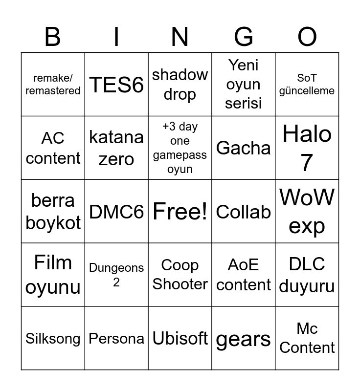 This bingo card has a free space and 24 words: Silksong, Dungeons 2, +3 day one gamepass oyun, gears, SoT güncelleme, remake/ remastered, TES6, shadow drop, Collab, WoW exp, berra boykot, katana zero, AoE content, DLC duyuru, AC content, Persona, Ubisoft, Yeni oyun serisi, Halo 7, Film oyunu, DMC6, Coop Shooter, Gacha and Mc Content.