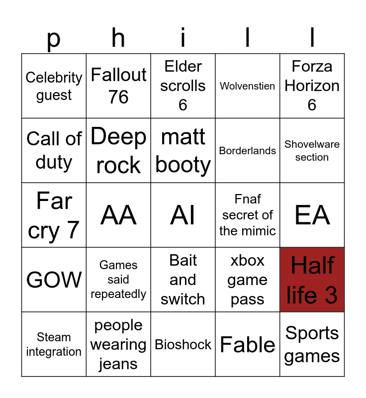 This bingo card has a free space and 24 words: Games said repeatedly, people wearing jeans, matt booty, Steam integration, Forza Horizon 6, Celebrity guest, Call of duty, Fallout 76, Fnaf secret of the mimic, Bait and switch, Borderlands, Far cry 7, xbox game pass, Half life 3, Deep rock, Fable, EA, Elder scrolls 6, Shovelware section, AA, Sports games, GOW, Wolvenstien and Bioshock.