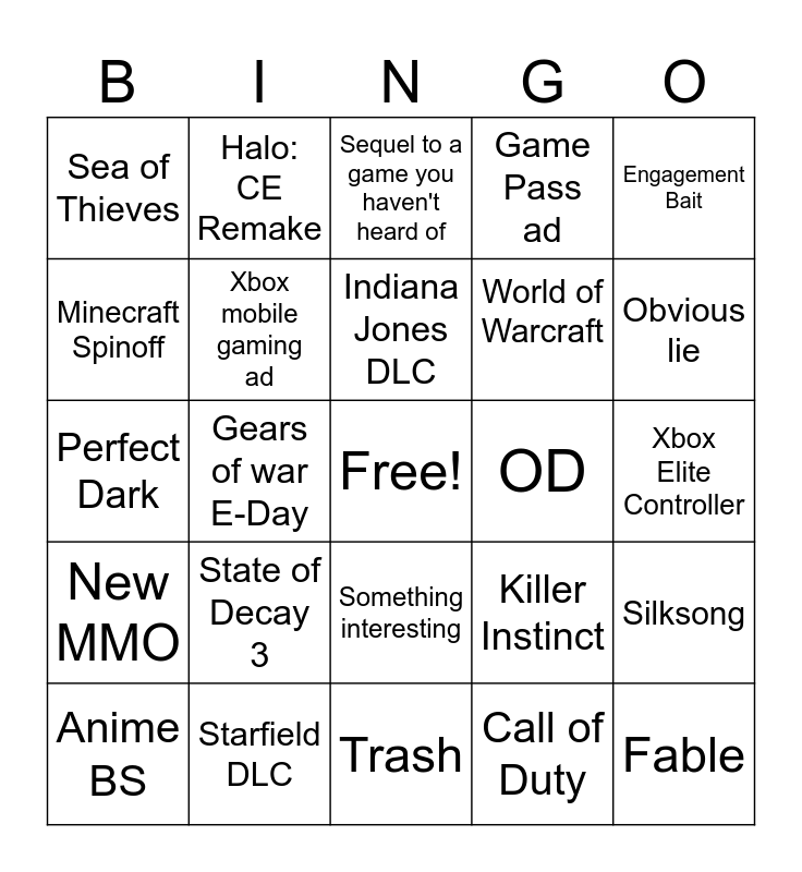 This bingo card has a free space and 24 words: State of Decay 3, Starfield DLC, Indiana Jones DLC, Anime BS, Engagement Bait, Sea of Thieves, Minecraft Spinoff, Halo: CE Remake, OD, Something interesting, World of Warcraft, Perfect Dark, Killer Instinct, Silksong, Xbox mobile gaming ad, Call of Duty, Xbox Elite Controller, Sequel to a game you haven't heard of, Obvious lie, Gears of war E-Day, Fable, New MMO, Game Pass ad and Trash.