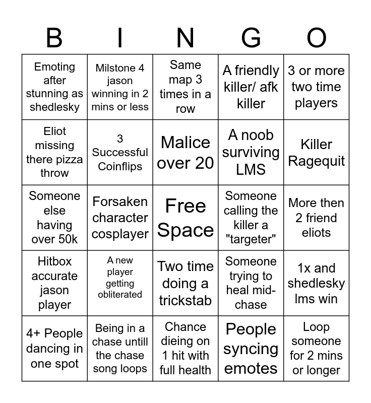 This bingo card has a free space and 24 words: A new player getting obliterated, Being in a chase untill the chase song loops, Malice over 20, 4+ People dancing in one spot, 3 or more two time players, Emoting after stunning as shedlesky, Eliot missing there pizza throw, Milstone 4 jason winning in 2 mins or less, Someone calling the killer a "targeter", Two time doing a trickstab, A noob surviving LMS, Someone else having over 50k, Someone trying to heal mid-chase, 1x and shedlesky lms win, 3 Successful Coinflips, People syncing emotes, More then 2 friend eliots, Same map 3 times in a row, Killer Ragequit, Forsaken character cosplayer, Loop someone for 2 mins or longer, Hitbox accurate jason player, A friendly killer/ afk killer and Chance dieing on 1 hit with full health.