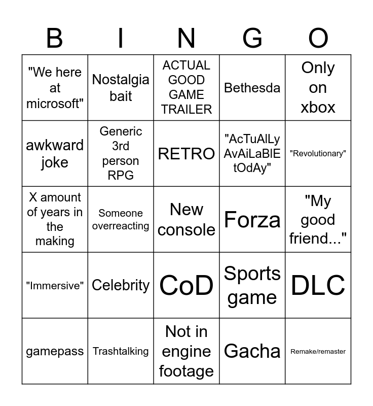 This bingo card has a free space and 24 words: Celebrity, Trashtalking, RETRO, gamepass, Only on xbox, "We here at microsoft", awkward joke, Nostalgia bait, Forza, CoD, "AcTuAlLy AvAiLaBlE tOdAy", X amount of years in the making, Sports game, DLC, Generic 3rd person RPG, Gacha, "My good friend...", ACTUAL GOOD GAME TRAILER, "Revolutionary", Someone overreacting, Remake/remaster, "Immersive", Bethesda and Not in engine footage.