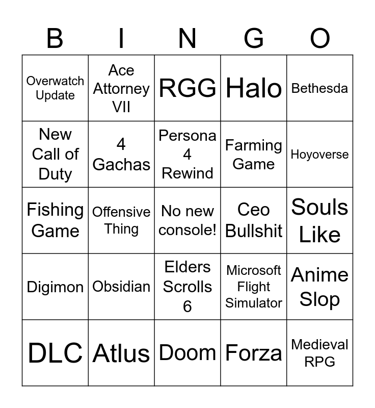 This bingo card has a free space and 24 words: Obsidian, Atlus, Persona 4 Rewind, DLC, Bethesda, Overwatch Update, New Call of Duty, Ace Attorney VII, Ceo Bullshit, Elders Scrolls 6, Farming Game, Fishing Game, Microsoft Flight Simulator, Anime Slop, 4 Gachas, Forza, Souls Like, RGG, Hoyoverse, Offensive Thing, Medieval RPG, Digimon, Halo and Doom.