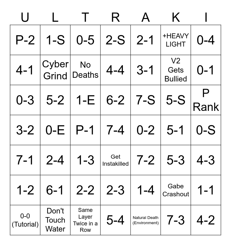 This bingo card has 49 words: Gabe Crashout, V2 Gets Bullied, Natural Death (Environment), 0-E, 1-E, 0-S, 1-S, Same Layer Twice in a Row, +HEAVY LIGHT, Get Instakilled, 0-4, 2-S, 5-S, 7-S, 6-1, 5-1, 4-1, 0-1, 1-1, 2-1, 3-1, P-1, P-2, Cyber Grind, 0-0 (Tutorial), No Deaths, P Rank, Don't Touch Water, 6-2, 5-2, 4-2, 0-2, 1-2, 2-2, 3-2, 7-2, 5-3, 4-3, 0-3, 1-3, 2-3, 7-1, 7-4, 5-4, 4-4, 0-5, 1-4, 2-4 and 7-3.