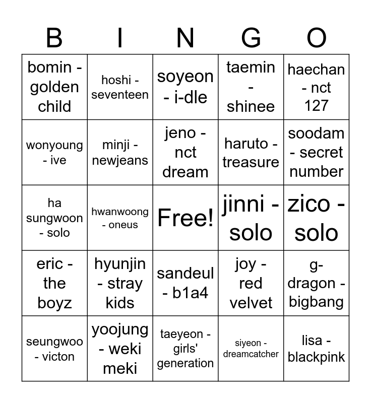 This bingo card has a free space and 50 words: jungkook - bts, lisa - blackpink, yeonjun - txt, taeyeon - girls' generation, hyunjin - stray kids, iu - solo, hoshi - seventeen, karina - aespa, wonyoung - ive, sakura - le sserafim, minji - newjeans, taemin - shinee, g-dragon - bigbang, joy - red velvet, chungha - solo, sunghoon - enhypen, jeno - nct dream, jinni - solo, jiwon - fromis_9, haechan - nct 127, hwanwoong - oneus, siyeon - dreamcatcher, bomin - golden child, haruto - treasure, yuna - itzy, keeho - p1harmony, soodam - secret number, hongjoong - ateez, soyeon - i-dle, sandeul - b1a4, arin - oh my girl, wonho - solo, solar - mamamoo, sana - twice, yoojung - weki meki, nancy - momoland, moonbin - astro, yuna kim - solo, hyolyn - solo, zico - solo, kevin - the boyz, alexa - solo, bm - kard, heejin - loona, seungwoo - victon, ha sungwoon - solo, kwon eunbi - solo, chaeryeong - itzy, eric - the boyz and nakyung - fromis_9.