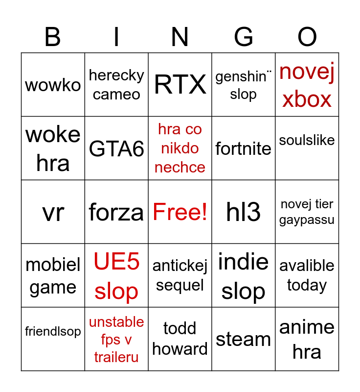 This bingo card has a free space and 24 words: UE5 slop, unstable fps v traileru, hra co nikdo nechce, friendlsop, novej xbox, wowko, woke hra, herecky cameo, hl3, antickej sequel, fortnite, vr, indie slop, avalible today, GTA6, steam, novej tier gaypassu, RTX, soulslike, forza, anime hra, mobiel game, genshin¨ slop and todd howard.