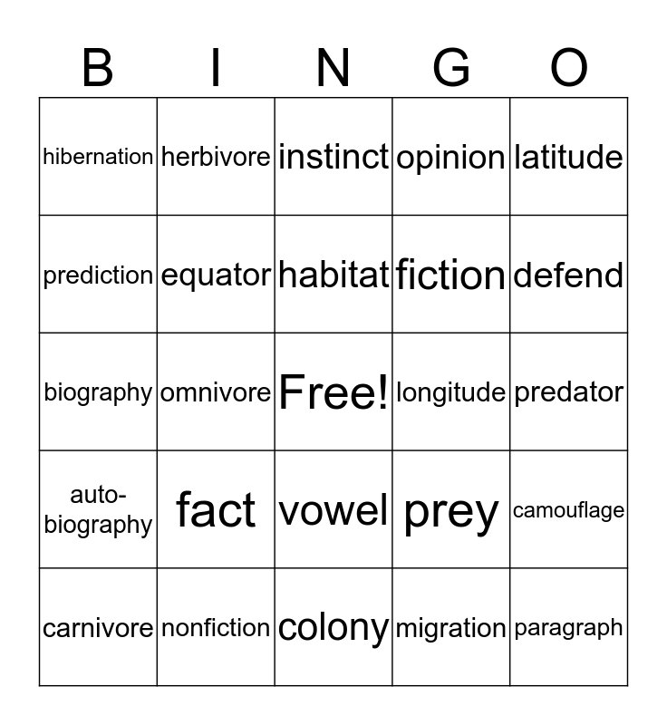 This bingo card has a free space and 24 words: fact, nonfiction, habitat, carnivore, latitude, hibernation, prediction, herbivore, longitude, vowel, fiction, biography, prey, camouflage, equator, migration, predator, instinct, defend, omnivore, paragraph, auto-biography, opinion and colony.