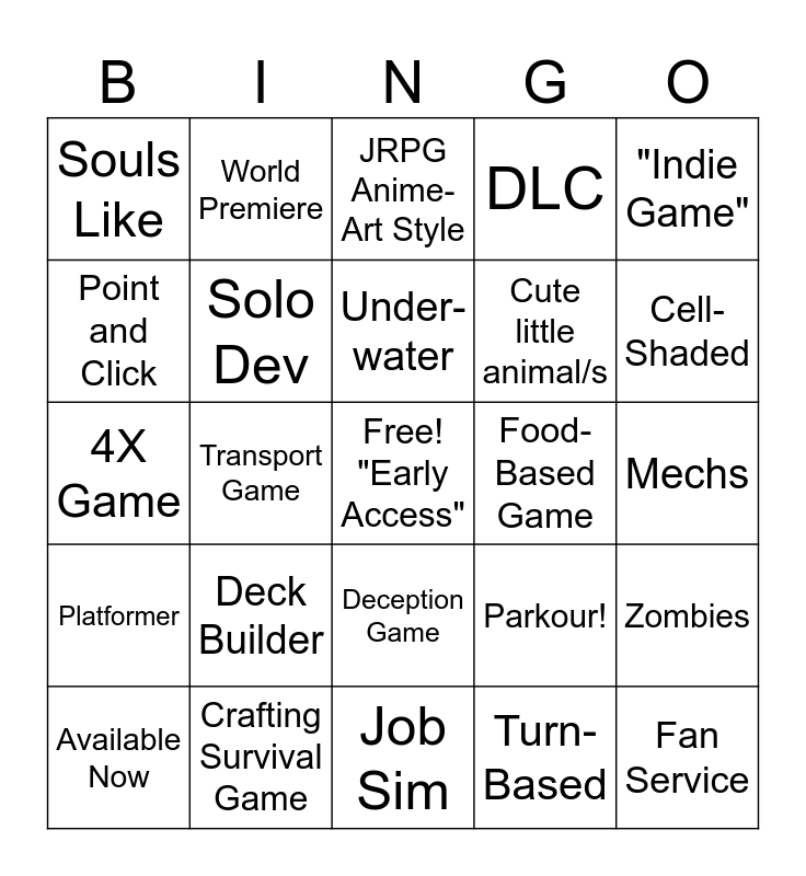 This bingo card has a free space and 24 words: Deck Builder, Crafting Survival Game, Under-water, Available Now, "Indie Game", Souls Like, Point and Click, World Premiere, Food-Based Game, Deception Game, Cute little animal/s, 4X Game, Parkour!, Zombies, Solo Dev, Turn-Based, Mechs, JRPG Anime-Art Style, Cell- Shaded, Transport Game, Fan Service, Platformer, DLC and Job Sim.