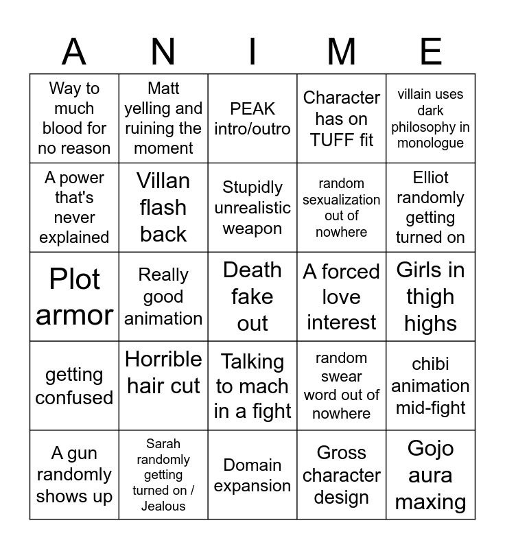 This bingo card has 25 words: Horrible hair cut, Domain expansion, Stupidly unrealistic weapon, A gun randomly shows up, villain uses dark philosophy in monologue, Way to much blood for no reason, A power that's never explained, Matt yelling and ruining the moment, A forced love interest, Talking to mach in a fight, random sexualization out of nowhere, Plot armor, random swear word out of nowhere, chibi animation mid-fight, Villan flash back, Gojo aura maxing, Girls in thigh highs, PEAK intro/outro, Elliot randomly getting turned on, Really good animation, Death fake out, Sarah randomly getting turned on / Jealous, getting confused, Character has on TUFF fit and Gross character design.