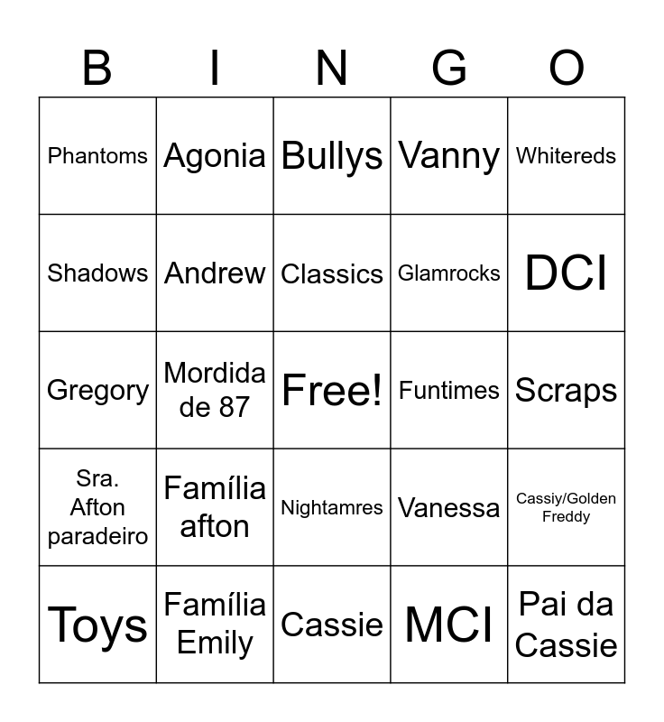 This bingo card has a free space and 24 words: Família afton, Família Emily, Classics, Toys, Whitereds, Phantoms, Shadows, Agonia, Funtimes, Nightamres, Glamrocks, Gregory, Vanessa, Cassiy/Golden Freddy, Andrew, MCI, Scraps, Bullys, DCI, Mordida de 87, Pai da Cassie, Sra. Afton paradeiro, Vanny and Cassie.