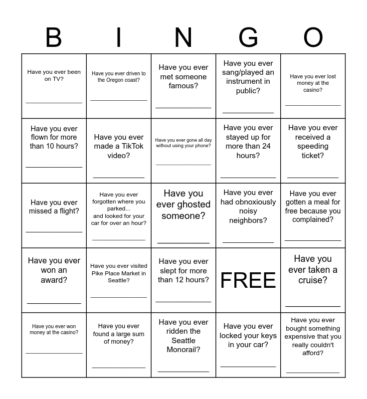 This bingo card has 25 words: Have you ever visited Pike Place Market in Seattle? _________________, Have you ever ridden the Seattle Monorail? ____________, Have you ever gone all day without using your phone? _____________________, Have you ever won money at the casino? ____________________, Have you ever lost money at the casino? __________________, Have you ever been on TV? _________________, Have you ever flown for more than 10 hours? ______________, Have you ever driven to the Oregon coast? ____________________, Have you ever had obnoxiously noisy neighbors? ____________, Have you ever slept for more than 12 hours? _____________, Have you ever stayed up for more than 24 hours? _____________, Have you ever missed a flight? ______________, FREE, Have you ever taken a cruise? ___________, Have you ever made a TikTok video? ____________, Have you ever bought something expensive that you really couldn't afford? ______________, Have you ever gotten a meal for free because you complained? ______________, Have you ever met someone famous? _____________, Have you ever received a speeding ticket? ____________, Have you ever forgotten where you parked... and looked for your car for over an hour? ________________, Have you ever ghosted someone? __________, Have you ever found a large sum of money? _______________, Have you ever won an award? ____________, Have you ever sang/played an instrument in public? ____________ and Have you ever locked your keys in your car? _____________.
