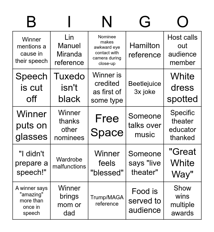 This bingo card has a free space and 29 words: A winner says "amazing" more than once in speech, Winner mentions their kids, Winner thanks other nominees, Production flub of some sort, Winner mentions a cause in their speech, Nominee makes awkward eye contact with camera during close-up, Tuxedo isn't black, Wardrobe malfunctions, Someone talks over music, Winner brings mom or dad, Specific theater educator thanked, Show wins multiple awards, Trump/MAGA reference, Food is served to audience, White dress spotted, Winner thanks >5 people, Winner feels "blessed", "I didn't prepare a speech!", Host calls out audience member, Winner puts on glasses, Someone says "live theater", Mention of an EGOT, Beetlejuice 3x joke, Speech is cut off, Hamilton reference, Lin Manuel Miranda reference, "Great White Way", Winner is credited as first of some type and Winner spins trophy.