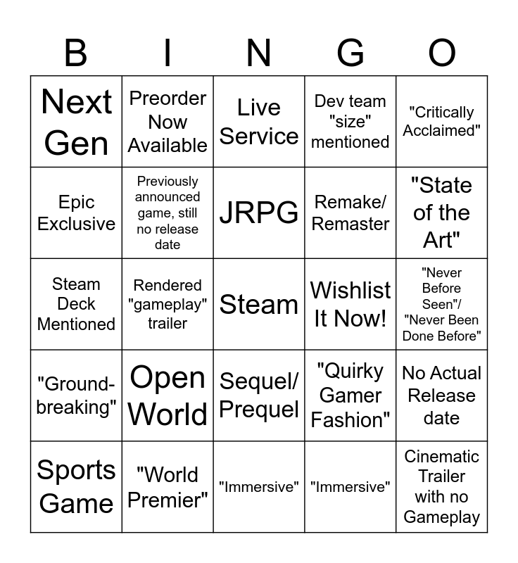 This bingo card has a free space and 24 words: Open World, "World Premier", JRPG, Sports Game, "Critically Acclaimed", Next Gen, Epic Exclusive, Preorder Now Available, Wishlist It Now!, Sequel/ Prequel, Remake/ Remaster, Steam Deck Mentioned, "Quirky Gamer Fashion", No Actual Release date, Previously announced game, still no release date, "Immersive", "Never Before Seen"/ "Never Been Done Before", Live Service, "State of the Art", Rendered "gameplay" trailer, Cinematic Trailer with no Gameplay, "Ground-breaking", Dev team "size" mentioned and "Immersive".