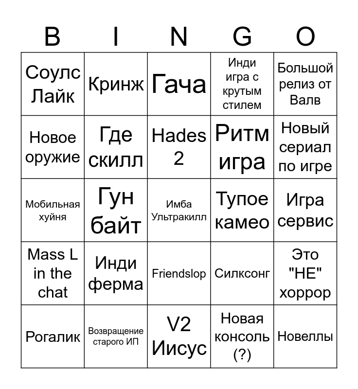 This bingo card has a free space and 24 words: Инди ферма, Возвращение старого ИП, Hades 2, Рогалик, Большой релиз от Валв, Соулс Лайк, Новое оружие, Кринж, Тупое камео, Friendslop, Ритм игра, Мобильная хуйня, Силксонг, Это "НЕ" хоррор, Где скилл, Новая консоль (?), Игра сервис, Гача, Новый сериал по игре, Гун байт, Новеллы, Mass L in the chat, Инди игра с крутым стилем and V2 Иисус.