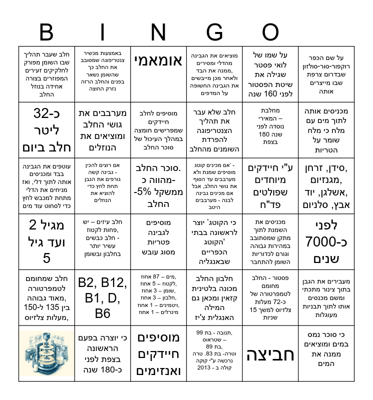 This bingo card has 1 images and 35 words: חלבון החלב מכונה בלטינית קזאין ומכאן גם המילה האנגלית צ'יז, מים – 87 אחוז, לקטוז – 5 אחוז, שומן – 3 אחוז, חלבון – 3 אחוז, ויטמינים – 1 אחוז, מינרלים – 1 אחוז, תנובה - בת 99, שטראוס – בת 89, וטרה- בת 83. טרה נרכשה ע"י קוקה קולה ב - 2013, כ-32 ליטר חלב ביום, מגיל 2 ועד גיל 5, אם מכינים קוטג’ - מוסיפים שמנת ולא מערבבים עד הסוף את גושי החלב, אבל אם מכינים גבינה לבנה - מערבבים היטב, מערבבים את גושי החלב ומוציאים את הנוזלים, מוסיפים חיידקים ואנזימים, על שמו של לואי פסטר שגילה את שיטת הפסטור לפני 160 שנה, פסטור - החלב מחומם לטמפרטורה של כ-72 מעלות צלזיוס למשך 15 שניות, מכניסים אותה לתוך מים עם מלח כי מלח שומר על הטריות, מוציאים את הגבינה מהדלי ומסירים ממנה את הבד, ולאחר מכן מייבשים את הגבינה החשופה על המדפים, מעבירים את הגבן בתוך צינור מתכתי ומשם מכנסים אותו לתוך תבניות מעוגלות, אם רוצים להכין גבינה קשה - גורפים את הגבן תחת לחץ כדי להוציא את הנוזלים, חלב שלא עבר את תהליך הצנטריפוגה להפרדת השומנים מהחלב, חלב שעבר תהליך שבו השומן מפורק לחלקיקים זעירים המפוזרים בצורה אחידה בנוזל החלב, חלב שמחומם לטמפרטורה מאוד גבוהה, בין 135 ל-150 מעלות צלזיוס,, ע"י חיידקים מיוחדים שפולטים פד"ח, עוטפים את הגבינה בבד ומכניסים אותה לתוך דלי, ואז מניחים את הדלי מתחת למכבש לחץ כדי לסחוט עוד מים, אומאמי, סוכר החלב. מהווה כ--5% ממשקל החלב, חלב עיזים – יש פחות לקטוז, חלב כבשים - עשיר יותר בחלבון ובשומן, כי הקוטג’ יוצר לראשונה בבתי הקוטג' הכפריים שבאנגליה, מוסיפים לגבינה פטריות מסוג עובש, מכניסים את השמנת לתוך מתקן שמסתובב במהירות גבוהה וגורם לכדוריות השומן להתחבר, באמצעות מכשיר צנטריפוגה שמסובב את החלב כך שהשומן נשאר בפנים והחלב הרזה נזרק החוצה, מחלבת המאירי – נוסדה לפני 180 שנה בצפת, כי יוצרה בפעם הראשונה בצפת לפני כ-180 שנה, מוסיפים לחלב חיידקים שמפרישים חומצה במהלך העיכול של סוכר החלב, על שם הכפר רוקפור-סור-סולזון שבדרום צרפת שבו מייצרים אותה, כי סוכר נמס במים ומוציאים ממנה את המים, לפני כ-7000 שנים, סידן, זרחן, מגנזיום, אשלגן, יוד, אבץ, סלניום, B2, B12, B1, D, B6 and חביצה.