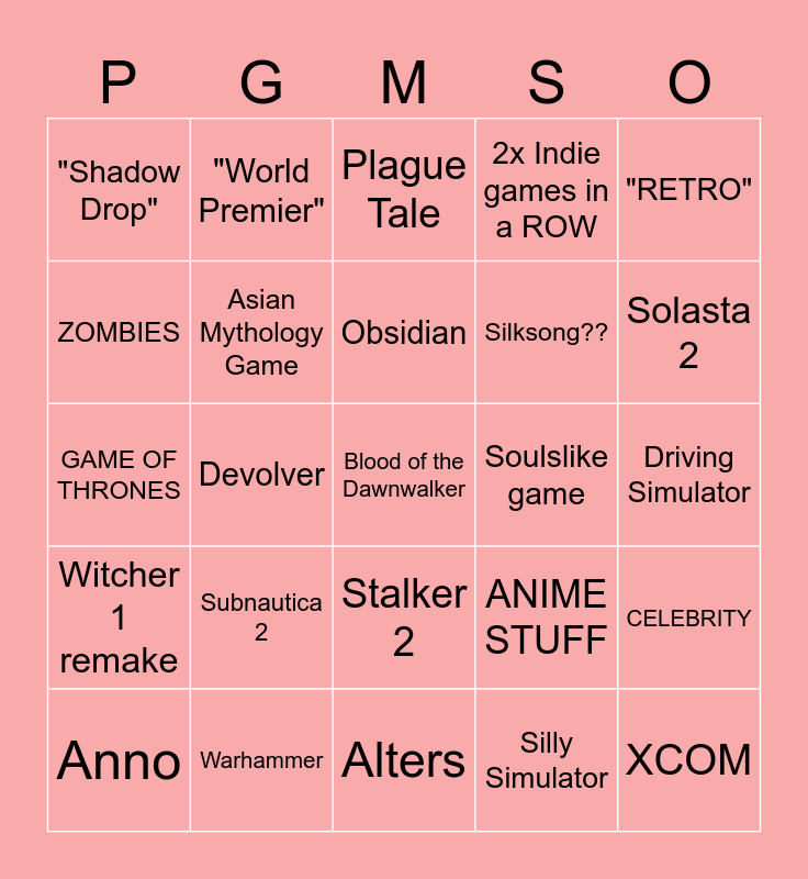 This bingo card has 25 words: Subnautica 2, Alters, Obsidian, Anno, "RETRO", "Shadow Drop", ZOMBIES, "World Premier", Soulslike game, Stalker 2, Silksong??, GAME OF THRONES, ANIME STUFF, CELEBRITY, Asian Mythology Game, XCOM, Driving Simulator, Plague Tale, Solasta 2, Devolver, Blood of the Dawnwalker, Warhammer, Witcher 1 remake, 2x Indie games in a ROW and Silly Simulator.
