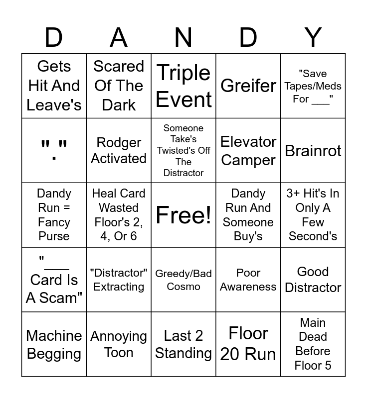 This bingo card has a free space and 44 words: Elevator Tag, Main Dead Before Floor 5, 1st Floor Death, Machine Begging, Horrid Trinkets, Floor 20 Run, Triple Event, Drama, "Save Tapes/Meds For ___", Annoying Toon, Greifer, Dandy Run And Someone Buy's, Greedy/Bad Cosmo, "Distractor" Extracting, Christmas Toon In Run, Last 2 Standing, Everyone Dying To Goob/Scraps, Dandy Run = Fancy Purse, Shippers, Brainrot, Scared Of The Dark, "Who's Distracting", "We're Cooked", Gets Hit And Leave's, Ran Down, 3+ Hit's In Only A Few Second's, Med/Band "Thief", Bad Extractor On Last Machine, Poor Awareness, "___ Card Is A Scam", Someone Outlives One Of Us, Good Distractor, 5+ People Alive At 15+, Main's Being Worshipped, Heal Card Wasted Floor's 2, 4, Or 6, "No Buy" On A Non Dandy Run, Fancy Purse..., Actually Spawn Twisted Dandy, Someone Take's Twisted's Off The Distractor, ".", Elevator Camper, Toon Display Name, Rodger Activated and Someone Kill's Themselves "Gtg/I'm Leaving This Run".