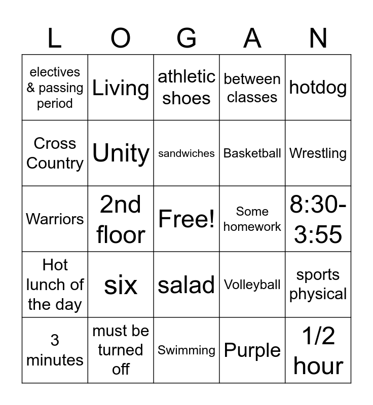 This bingo card has a free space and 39 words: 1965, Valor, Integrity, Unity, 3 minutes, salad, sandwiches, pizza, hotdog, Hot lunch of the day, 2nd floor, between classes, 1/2 hour, 8:30-3:55, Some homework, six, 3 numbers, electives & passing period, Football, Volleyball, Cross Country, Swimming, Basketball, Wrestling, Track, student planner, Mrs. Hansen, Art, World Language, Living, Tech, Comfortable clothes, athletic shoes, must be turned off, Purple, White, sports physical, Warriors and main office.