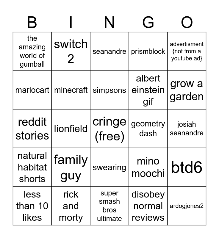 This bingo card has a free space and 24 words: family guy, rick and morty, simpsons, less than 10 likes, advertisment {not from a youtube ad}, the amazing world of gumball, mariocart, switch 2, geometry dash, swearing, albert einstein gif, reddit stories, mino moochi, btd6, minecraft, disobey normal reviews, josiah seanandre, seanandre, grow a garden, lionfield, ardogjones2, natural habitat shorts, prismblock and super smash bros ultimate.