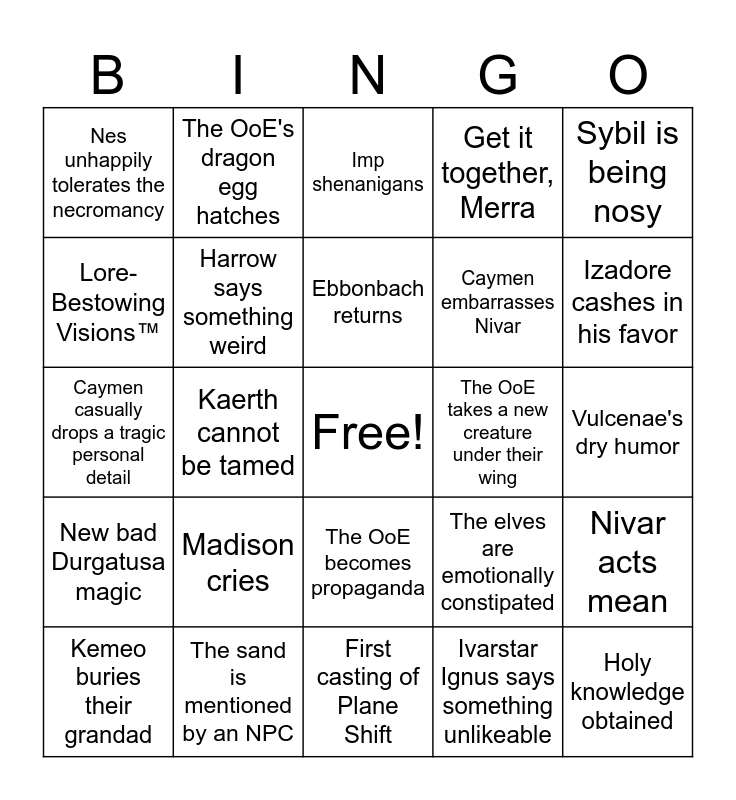 This bingo card has a free space and 24 words: Madison cries, The sand is mentioned by an NPC, Ebbonbach returns, Kemeo buries their grandad, Sybil is being nosy, Nes unhappily tolerates the necromancy, Lore-Bestowing Visions™, The OoE's dragon egg hatches, The OoE takes a new creature under their wing, The OoE becomes propaganda, Caymen embarrasses Nivar, Caymen casually drops a tragic personal detail, The elves are emotionally constipated, Nivar acts mean, Harrow says something weird, Ivarstar Ignus says something unlikeable, Vulcenae's dry humor, Imp shenanigans, Izadore cashes in his favor, Kaerth cannot be tamed, Holy knowledge obtained, New bad Durgatusa magic, Get it together, Merra and First casting of Plane Shift.