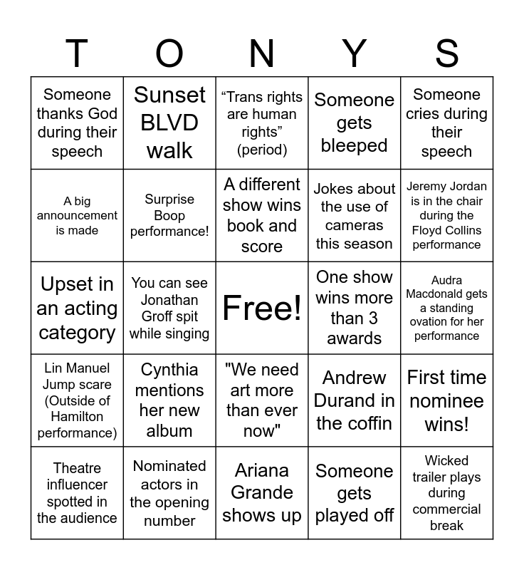 This bingo card has a free space and 49 words: "Holding Space" Joke, Wicked trailer plays during commercial break, Wicked is mentioned, Ariana Grande shows up, Cynthia mentions her new album, "Green Light" by Lorde is played, Sunset BLVD walk, Cole Escola appears as Mary Todd Lincoln, A big announcement is made, Jenifer Simard is not in the Death Becomes Her performance, Surprise Boop performance!, Someone gets bleeped, First time nominee wins!, Andrew Durand in the coffin, Joke about musicals with corpses, Mincemeat cast plays more than one character in their performance, A different show wins book and score, One show wins more than 3 awards, Weird product tie in (think Tony the Tiger on the red carpet in 2023), Someone cries during their speech, You can see Jonathan Groff spit while singing, Someone gets played off, Someone thanks God during their speech, Jokes about the use of cameras this season, Jeremy Jordan yodels, Jeremy Jordan is in the chair during the Floyd Collins performance, Theatre influencer spotted in the audience, "Happy Pride", "We need art more than ever now", Lin Manuel Jump scare (Outside of Hamilton performance), Chorus Line Mentioned, "Don't forget to vote", Patti Lupone is mentioned, "We could see Boop!", Nominated actors in the opening number, Jasmine Amy Rogers appears as Betty Boop, Cole Escola appears as Mary Todd Lincoln, William Finn Tribute, Audra Macdonald gets a standing ovation for her performance, Nicole Scherzinger gets a standing ovation for her performance, A show that opened in the summer or fall wins a major category, Death Becomes Her does one of their viral songs, Someone makes a cringy or tasteless joke about AI, A major contender walks away empty handed, Upset in an acting category, “Trans rights are human rights” (period), Older presenter starts rambling, Someone is called “mother” and Cynthia does the battle cry.