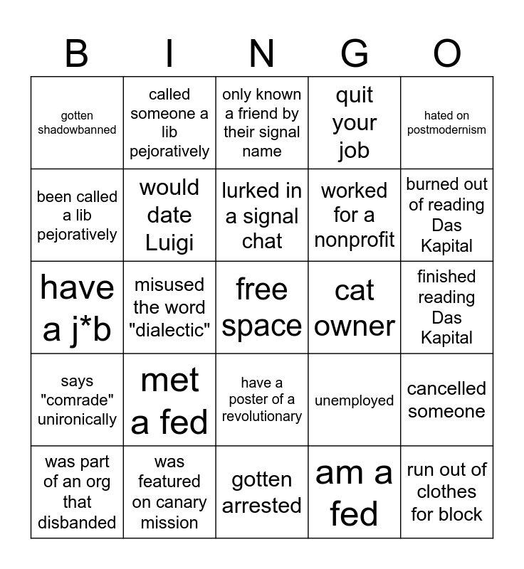 This bingo card has a free space and 42 words: gotten cancelled, lurked in a signal chat, have multiple aliases, met a fed, am a fed, cancelled someone, run out of clothes for block, dated someone in your org, only known a friend by their signal name, have a poster of a revolutionary, finished reading Das Kapital, burned out of reading Das Kapital, misused the word "dialectic", hated on postmodernism, quoted Fanon, unemployed, dropped out of school, have a j*b, thinking about grad school, called someone a lib pejoratively, been called a lib pejoratively, gotten laid off or fired, cut off a zionist, gotten shadowbanned, have a conservative parent, had a Bernie phase, worked for a nonprofit, dumped someone for their politics, watches Hasan, can't spell bourgeoisie, live(d) in a commune, says "comrade" unironically, would date Luigi, gotten arrested, use a non-motorized form of transportation, was part of an org that disbanded, was featured on canary mission, cat owner, thinks Luigi is overrated, fluent in multiple languages, quit your job and lowkey a prepper.