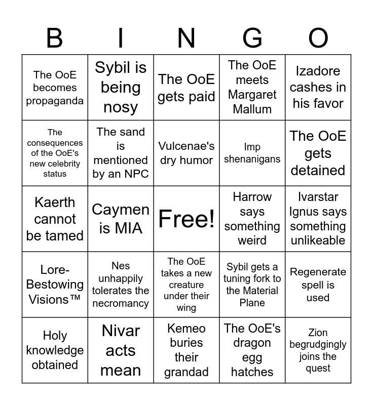 This bingo card has a free space and 24 words: Nes unhappily tolerates the necromancy, Nivar acts mean, Vulcenae's dry humor, Holy knowledge obtained, Izadore cashes in his favor, The OoE becomes propaganda, The consequences of the OoE's new celebrity status, Sybil is being nosy, Harrow says something weird, The OoE takes a new creature under their wing, Imp shenanigans, Kaerth cannot be tamed, Sybil gets a tuning fork to the Material Plane, Regenerate spell is used, The sand is mentioned by an NPC, The OoE's dragon egg hatches, Ivarstar Ignus says something unlikeable, The OoE gets paid, The OoE gets detained, Caymen is MIA, Zion begrudgingly joins the quest, Lore-Bestowing Visions™, The OoE meets Margaret Mallum and Kemeo buries their grandad.