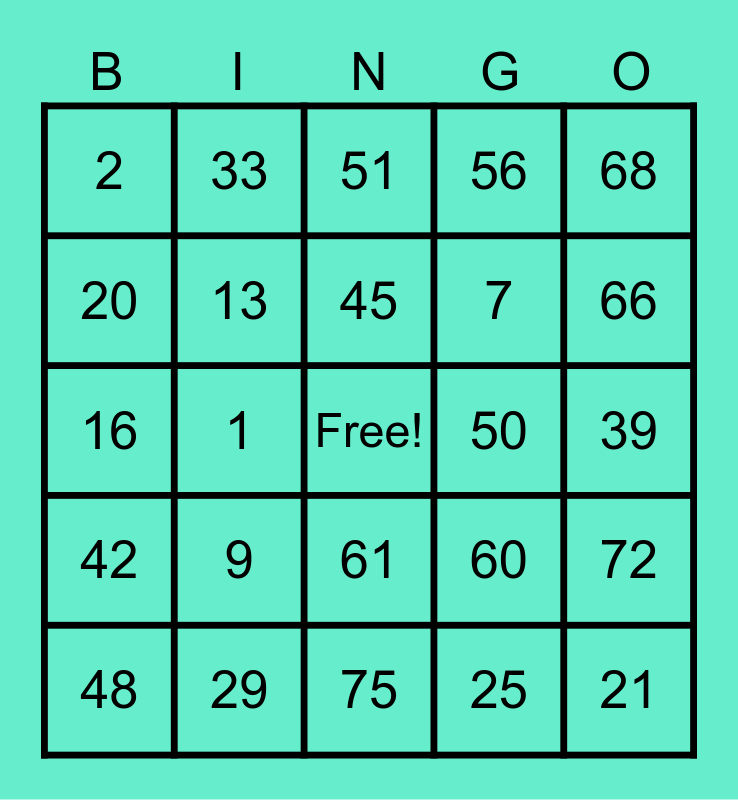This bingo card has a free space and 24 words: 9, 29, 45, 48, 68, 2, 20, 33, 50, 61, 7, 16, 60, 72, 13, 25, 39, 51, 66, 1, 21, 42, 56 and 75.