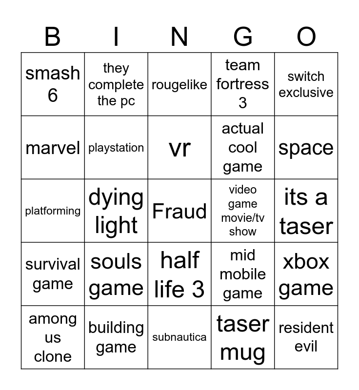 This bingo card has a free space and 24 words: souls game, building game, vr, among us clone, switch exclusive, smash 6, marvel, they complete the pc, video game movie/tv show, half life 3, actual cool game, platforming, mid mobile game, xbox game, playstation, taser mug, its a taser, rougelike, space, dying light, resident evil, survival game, team fortress 3 and subnautica.