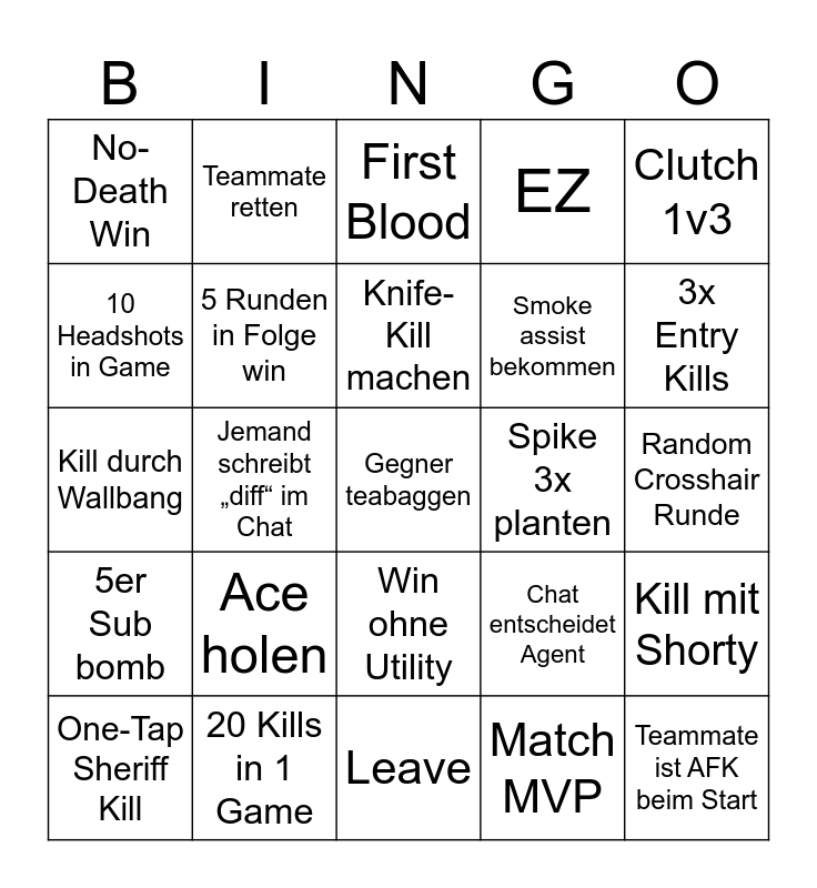 This bingo card has a free space and 24 words: Ace holen, 20 Kills in 1 Game, Knife-Kill machen, One-Tap Sheriff Kill, Clutch 1v3, No-Death Win, 10 Headshots in Game, Teammate retten, Spike 3x planten, Win ohne Utility, Smoke assist bekommen, Kill durch Wallbang, Chat entscheidet Agent, Kill mit Shorty, 5 Runden in Folge win, Match MVP, Random Crosshair Runde, First Blood, 3x Entry Kills, Jemand schreibt „diff“ im Chat, Teammate ist AFK beim Start, 5er Sub bomb, EZ and Leave.