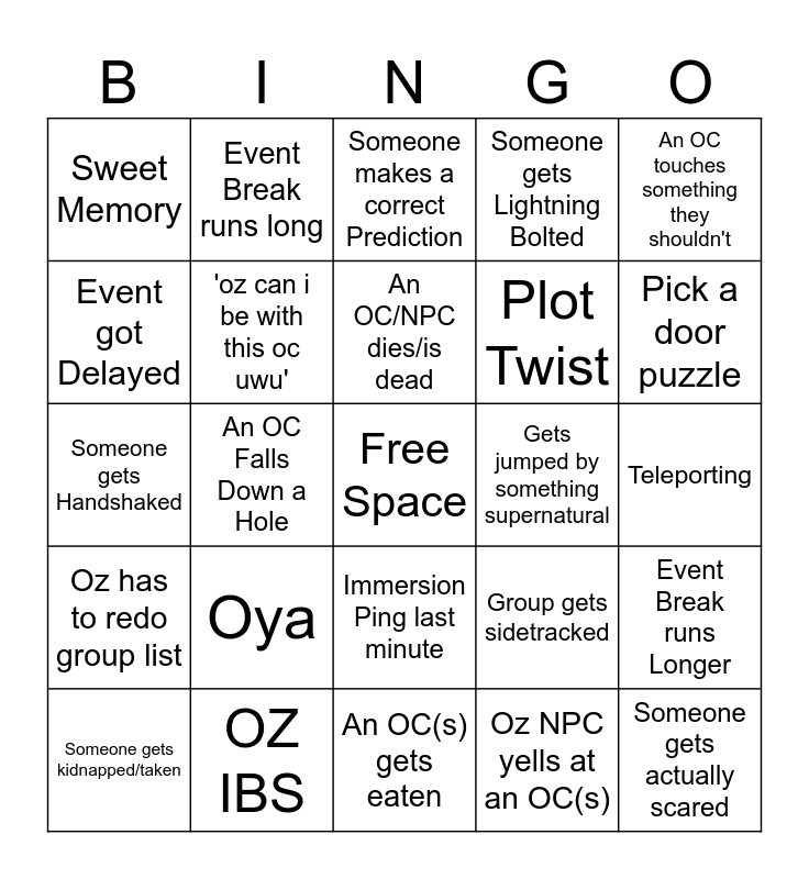 This bingo card has a free space and 24 words: Oya, OZ IBS, An OC/NPC dies/is dead, Someone gets kidnapped/taken, An OC touches something they shouldn't, Sweet Memory, Event got Delayed, Event Break runs long, Gets jumped by something supernatural, Immersion Ping last minute, Plot Twist, Someone gets Handshaked, Group gets sidetracked, Event Break runs Longer, 'oz can i be with this oc uwu', Oz NPC yells at an OC(s), Teleporting, Someone makes a correct Prediction, Pick a door puzzle, An OC Falls Down a Hole, Someone gets actually scared, Oz has to redo group list, Someone gets Lightning Bolted and An OC(s) gets eaten.