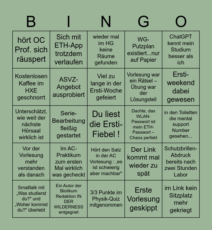 This bingo card has a free space and 24 words: Im AC- Praktikum zum ersten Mal wirklich was gecheckt, Ein Autor der Biotikum Redaktion IN DER WILDERNESS entgegnet, Viel zu lange in der Ersti-Woche gefeiert, Smalltalk mit „Was studierst du?" und „Woher kommst du?" überlebt, ChatGPT kennt mein Studium besser als ich, hört OC Prof. sich räuspert, Kostenlosen Kaffee im HXE geschnorrt, Sich mit ETH-App trotzdem verlaufen, Dachte, das WLAN-Passwort ist mein ETH-Passwort – Chaos perfekt, Hört den Satz in der AC Vorlesung : ,es ist schwierig aber machbar", Vorlesung war ein Rätsel – Übung war der Lösungsteil, Unterschätzt, wie weit der nächste Hörsaal wirklich ist, Der Link kommt mal wieder zu spät, Schutzbrillen-Abdruck bereits nach zwei Stunden Labor, ASVZ- Angebot ausprobiert, Erste Vorlesung geskippt, in den Toiletten die mental support Number gesehen..., wieder mal im HG keine Räume gefunden, Ersti-weekend dabei gewesen, Serie-Bearbeitung fleißig gestartet, im Link kein Sitzplatz mehr gekriegt, Vor der Vorlesung mehr verstanden als danach, WG-Putzplan existiert...nur auf Papier and 3/3 Punkte im Physik-Quiz mitgenommen.