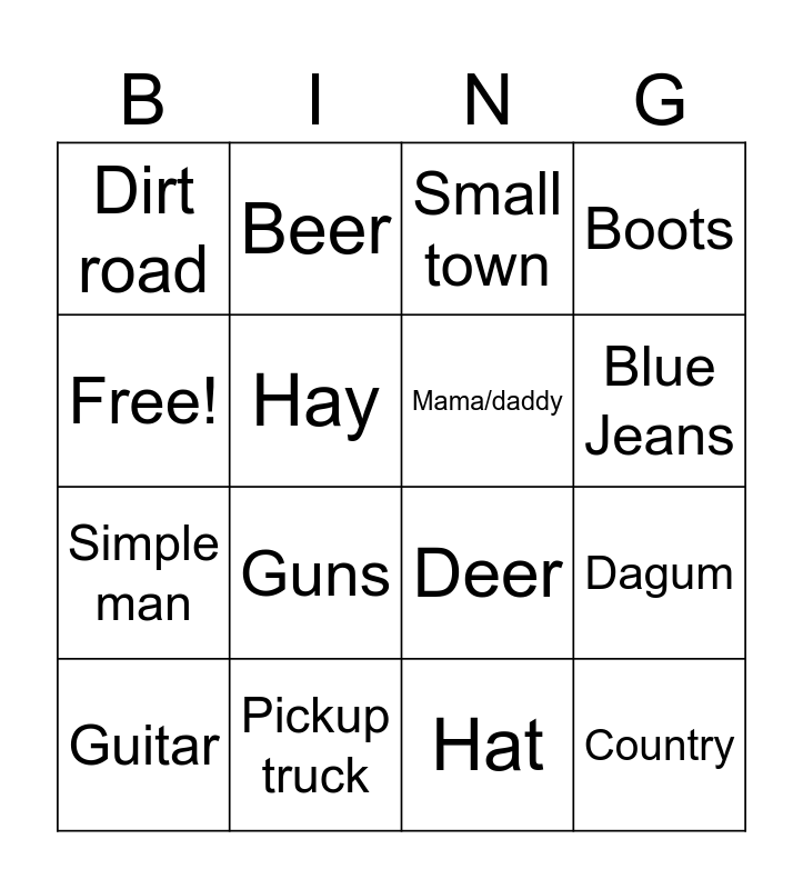 This bingo card has 16 words: Pickup truck, Dagum, Small town, Dirt road, Simple man, Beer, Deer, Hat, Free!, Hay, Guitar, Boots, Guns, Blue Jeans, Mama/daddy and Country.