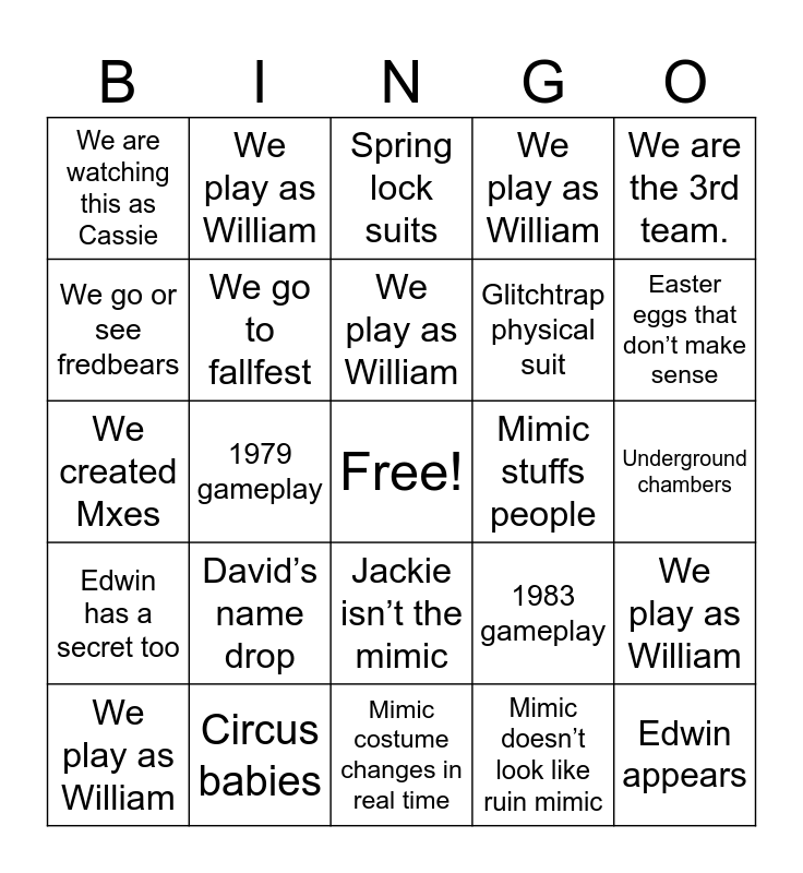 This bingo card has a free space and 29 words: We play as William, Tiger rock suit is secret, 1979 gameplay, More suits from tales, We are watching this as Cassie, Spring lock suits, We go to fallfest, David’s name drop, Mimic stuffs people, Circus babies, Underground chambers, Edwin appears, Mimic costume changes in real time, Mimic doesn’t look like ruin mimic, Easter eggs that don’t make sense, Camos from old story characters, Jackie isn’t the mimic, Edwin has a secret too, We are the 3rd team., We created Mxes, 1983 gameplay, Multiple endings, Glitchtrap physical suit, We go or see fredbears, We play as William, We play as William, We play as William, We play as William and We play as William.